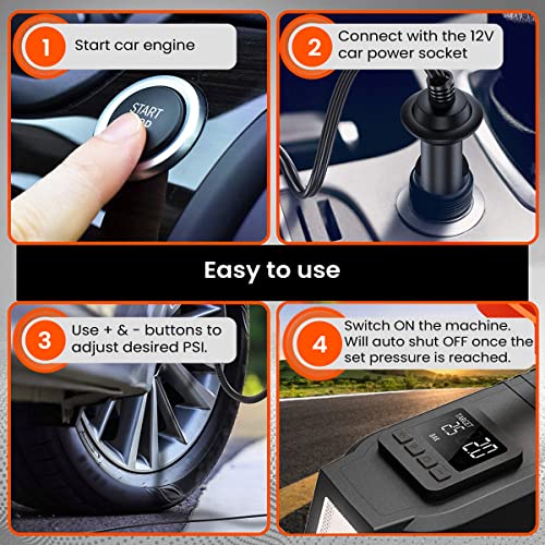 • Built-In Safety Features- Super bright LED flashlight makes our car air pump suitable for roadside emergency and night time use. AGARO 12V air compressor is ready whenever you need to inflate a flat tire.