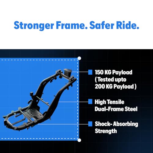 - Design : Sturdy dual-frame steel chassis. Spacious 720mm seat comfortably fits your family or business needs (up to 150 kg), with 165 mm ground clearance for Indian roads.