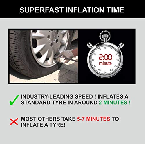 - [FASTER INFLATION] – The technologically advanced direct-drive 150W heavy-duty 100% pure copper core motor provides superfast inflation. We have the industry-best inflation time of 0-30 psi in around 2 minutes for a 145/70 R12 size tyre (v/s 3.5 to 4 minutes in most other inflators).