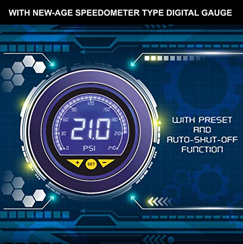 - [DIGITAL GAUGE IN PSI WITH AUTO CUT-OFF] – High precision, new age, backlit, speedometer-type digital gauge with preset and auto cut-off functions. Simply set the desired pressured in PSI and it will shut off automatically once the pressure is reached.