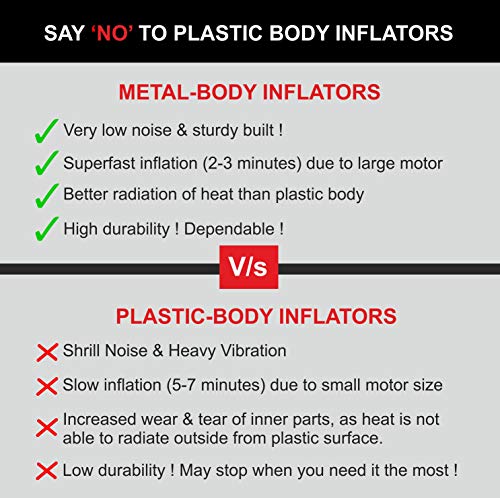 - [SAY NO TO PLASTIC INFLATORS] – Most plastic body air compressors are delicate, noisy and not able to radiate out the heat generated during compression. This results in increased wear and tear of the inner parts. Metal air compressors are stronger, sturdier, can radiate heat better and have much lower noise and vibration.