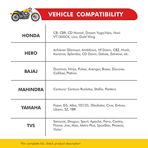 • Bike Compatibility: Honda: CB Shine , CB Twister, CB Trigger, CB Unicon, CBF Stunner, CBR 150R, CBR 250R, CB1000R, CBR1000RR, CD Hornet, VFR1200F, Dream Yuga, Dream Neo, VT 1300 CK, Livo, Gold Wing