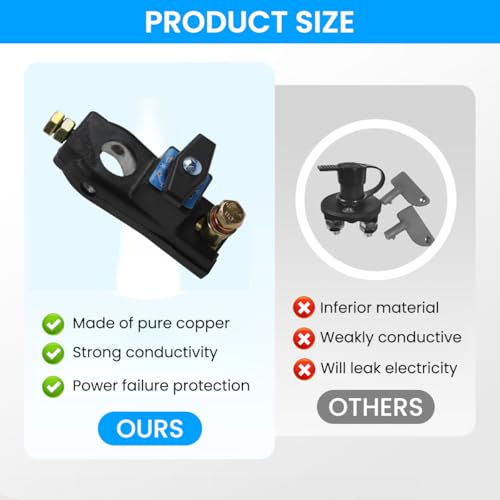 - PREVENTS BATTERY DRAIN FOR OPTIMAL PERFORMANCE: This battery disconnect switch effectively eliminates unnecessary battery drain by cutting off power when not in use. Ideal for vehicles, trucks, motorcycles, RVs, and boats, it keeps your battery charged and ready, reducing the risk of a weak or dead battery caused by parasitic loads over time.