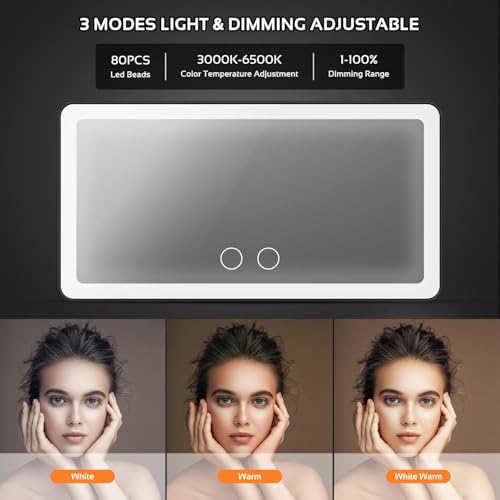 - Dimmable Bicolor Led Lights: The led car mirror has 64 white lights and 16 yellow lights , which is 50% brighter and use 60% less energy than normal bulbs. Short press the two sensor switches to switch between three light colors: white, yellow, white and yellow. Long press for dimming according to what you need. 2500-6500 K color temperature is equivalent to outdoor sunlight, so your makeup will look naturally flawless